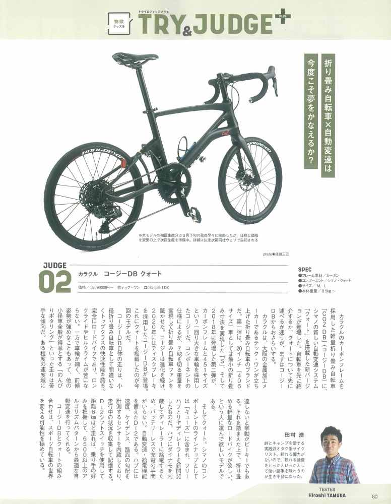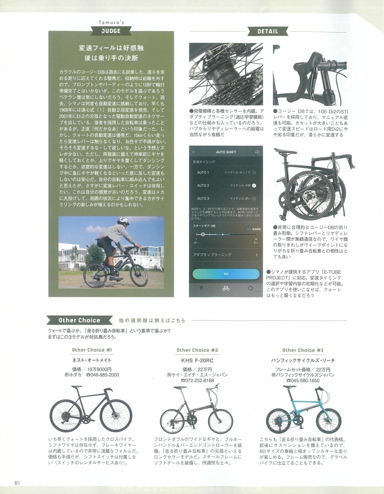 2ページ目では「DETAIL」コーナーで画像と文で機能をご紹介いただき、「無線通信なので、ワイヤ類の取りまわしがウィークポイントになりがちな折り畳み自転車との相性はとても良い」と、COZと組合せるメリットを説明いただきました。「Tamura’s JUDGE」コーナーでは、過去のシマノ製自動変速システムと比較して、「クォートの自動変速は優秀」なことを「お任せで不満がない」「予想とズレが少ない」「意に反した変速をしないのは安心」と表現されました。「変速はメカに丸投げして、周囲の状況により集中できる方がサイクリングの楽しみが増えるのかもしれない」という末尾の評定が、Q’AUTOシステムの可能性を示しています。実際、COZ Q’AUTOの初回生産分は、高額なライトモデルにご注文が集中しました。このことからも、Q’AUTOが「入門層向けの子供だまし」ではなく、ハイグレードバイクの価値を理解した愛好家に評価されていることが伺えます。