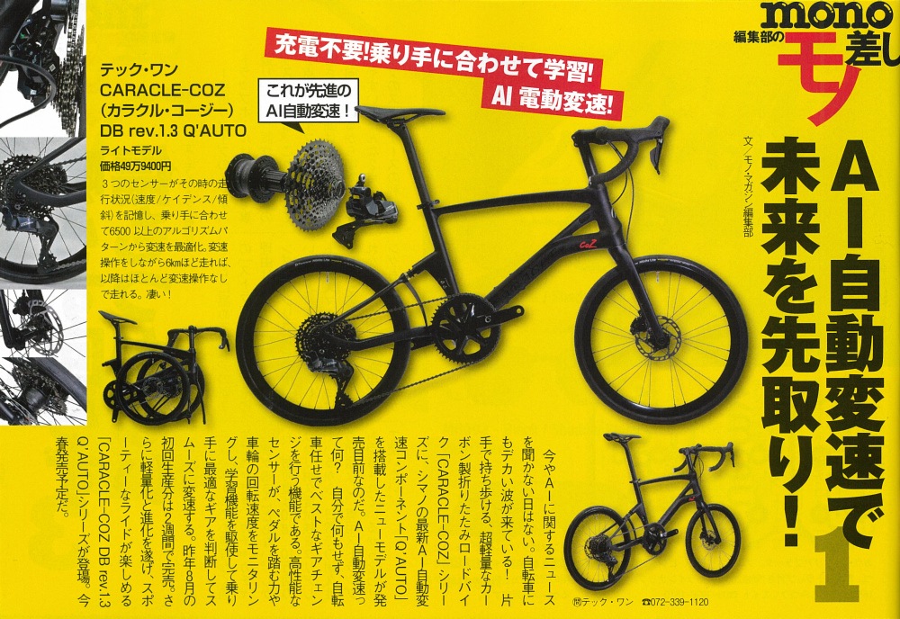巻頭に近い「mono編集部のモノ差し」コーナーに「AI自動変速で未来を先取り!」の見出しでご紹介いただきました。