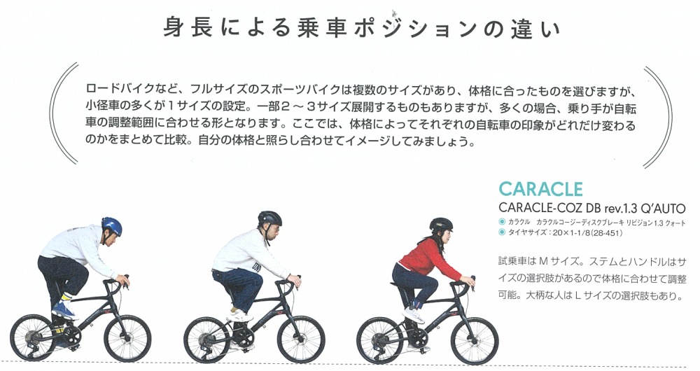 身長別最新モデル試乗レポートのコーナーでは、注目のAI自動変速コンポを搭載した『CARACLE-COZ Q’AUTO』を取り上げられました。試乗車はMサイズですが大柄な方にはLサイズもあり、価格差無しでハンドルとステムのサイズを選べるモデルもあります。