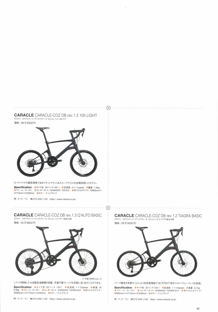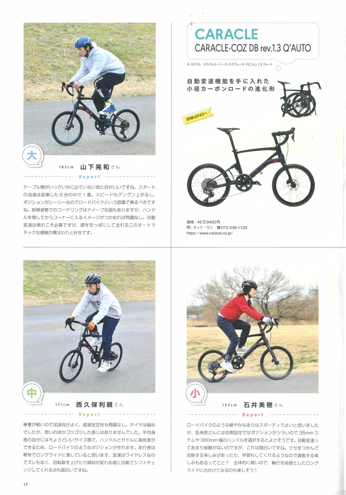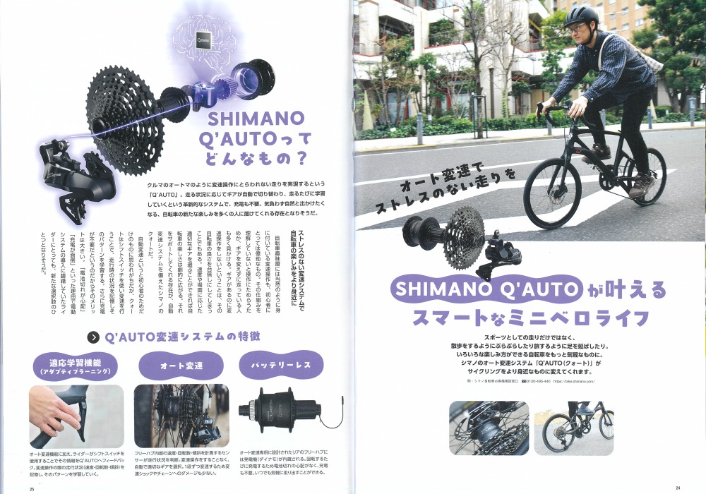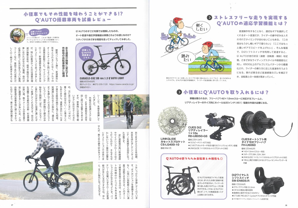 今号ではシマノのAI自動変速コンポーネント「Q’AUTO」が、サイクリングをより身近なものに変えてくれるシステムとして特集されました。ミニベロのQ’AUTO搭載車としてCARACLE-COZをご紹介いただいています。同じ記事が辰巳出版のウエブページでも紹介されています。