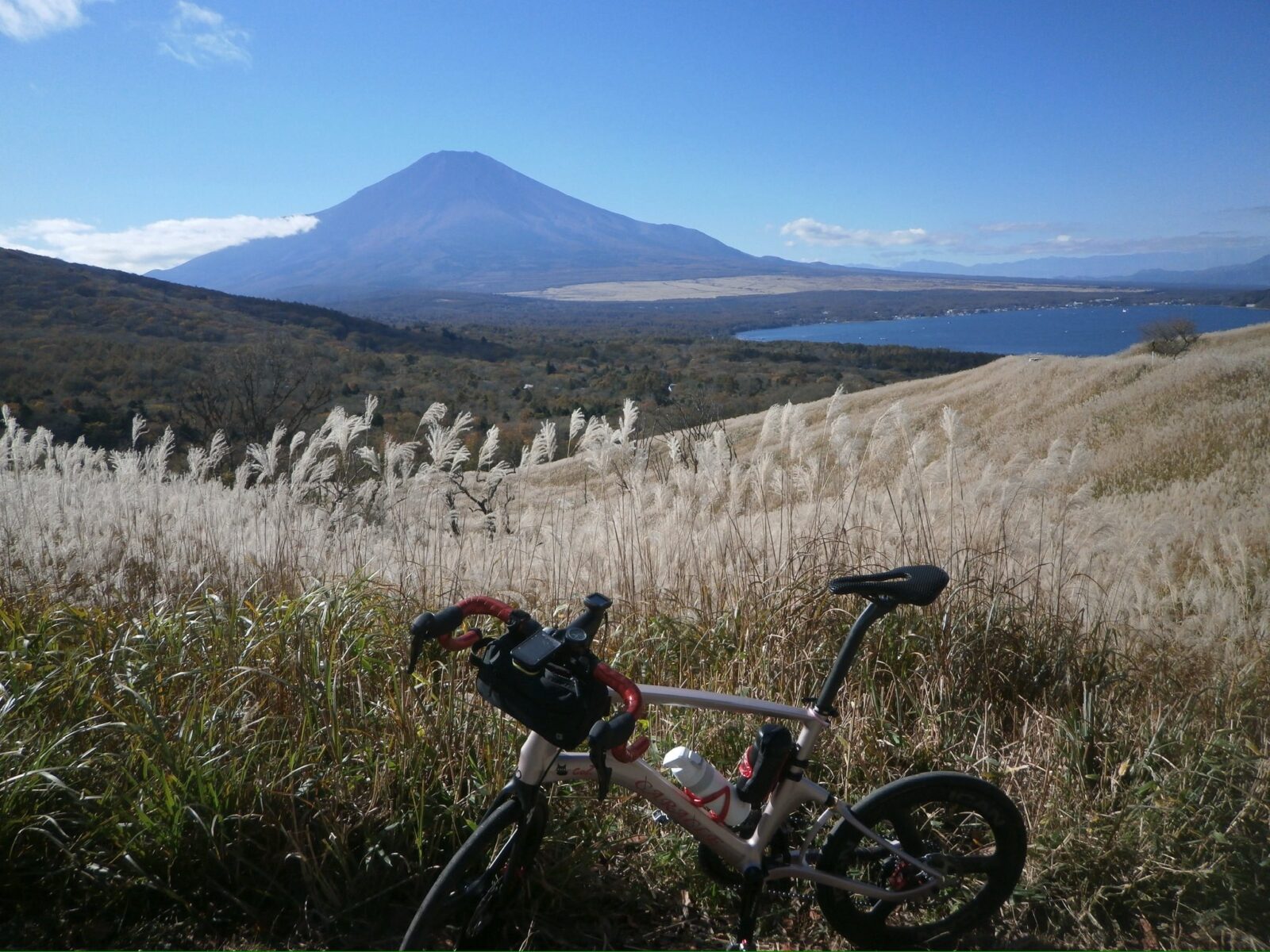 2枚目は11月に撮影されたもので、ススキが茂り茶色っぽい風景の向こうに山中湖、そしてさらにその向こうには冠雪が全くない富士山が鎮座しています。