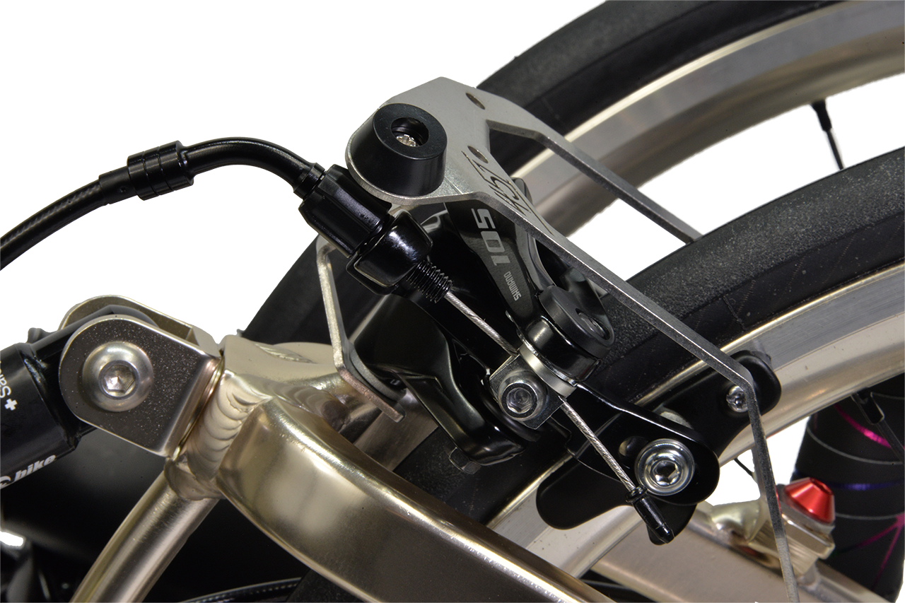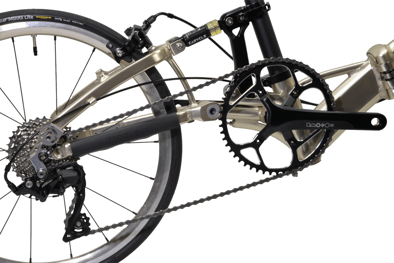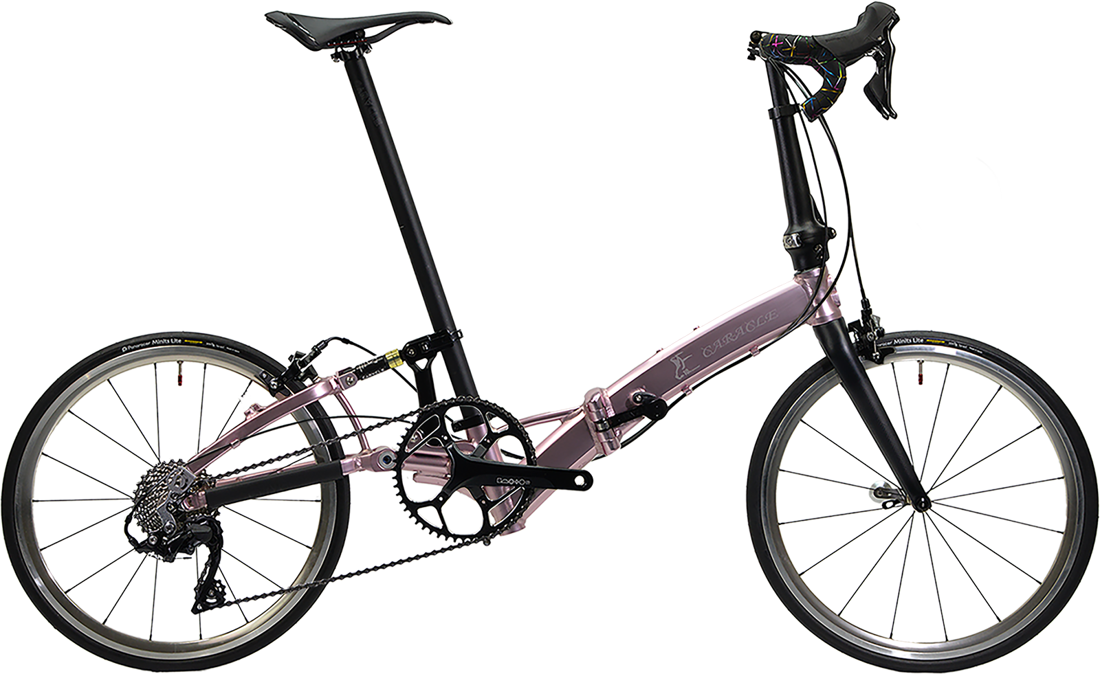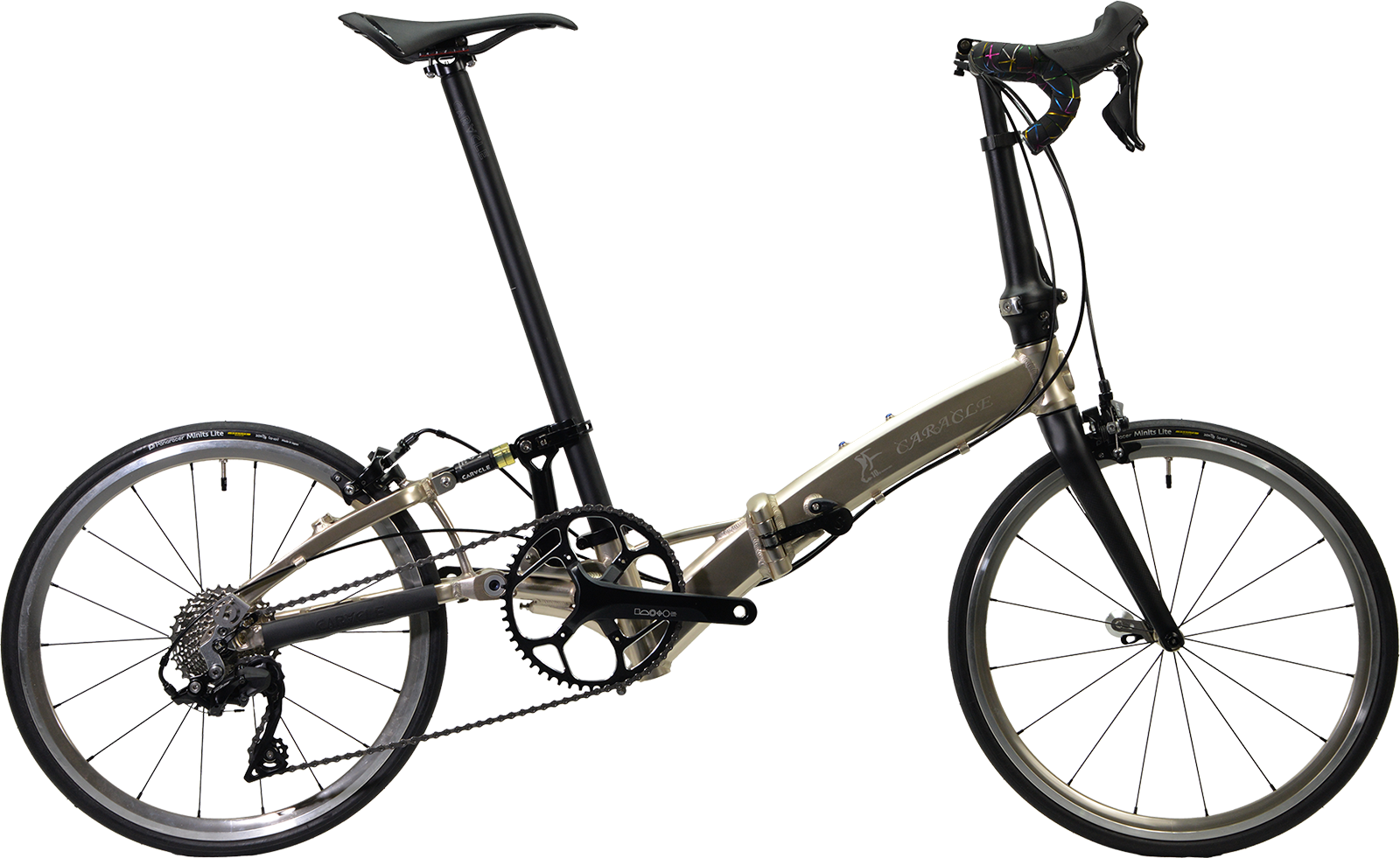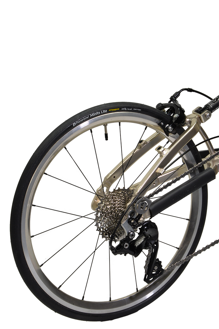 コンポーネントのグレードアップに加えて軽量化を徹底。まず、塗料を使わないアルマイト着色は、フレームを約100g軽量化できます。加えて、約1,100gの超軽量20インチWO(ETRTO451)ホイール「Z-LIGHT2」のフロントOLD74mmスペシャルバージョンに、超軽量日本製タイヤ「Panaracer ミニッツ・ライト」と同じく超軽量チューブ「Panaracer R’AIR」を装着し、ホイールだけで400g以上軽量化しました。コンポその他の軽量化も合わせて、CARACLE-S歴代最軽量の完成車重量約9.1kgを達成しています。デュアルコントロールレバー仕様のドロップハンドル車でありながら、乗っても、持っても、はっきり体感できる軽量化を成し遂げました。今後発売予定のオプションシートポストと交換すれば、8kg台も達成できる見込みです。