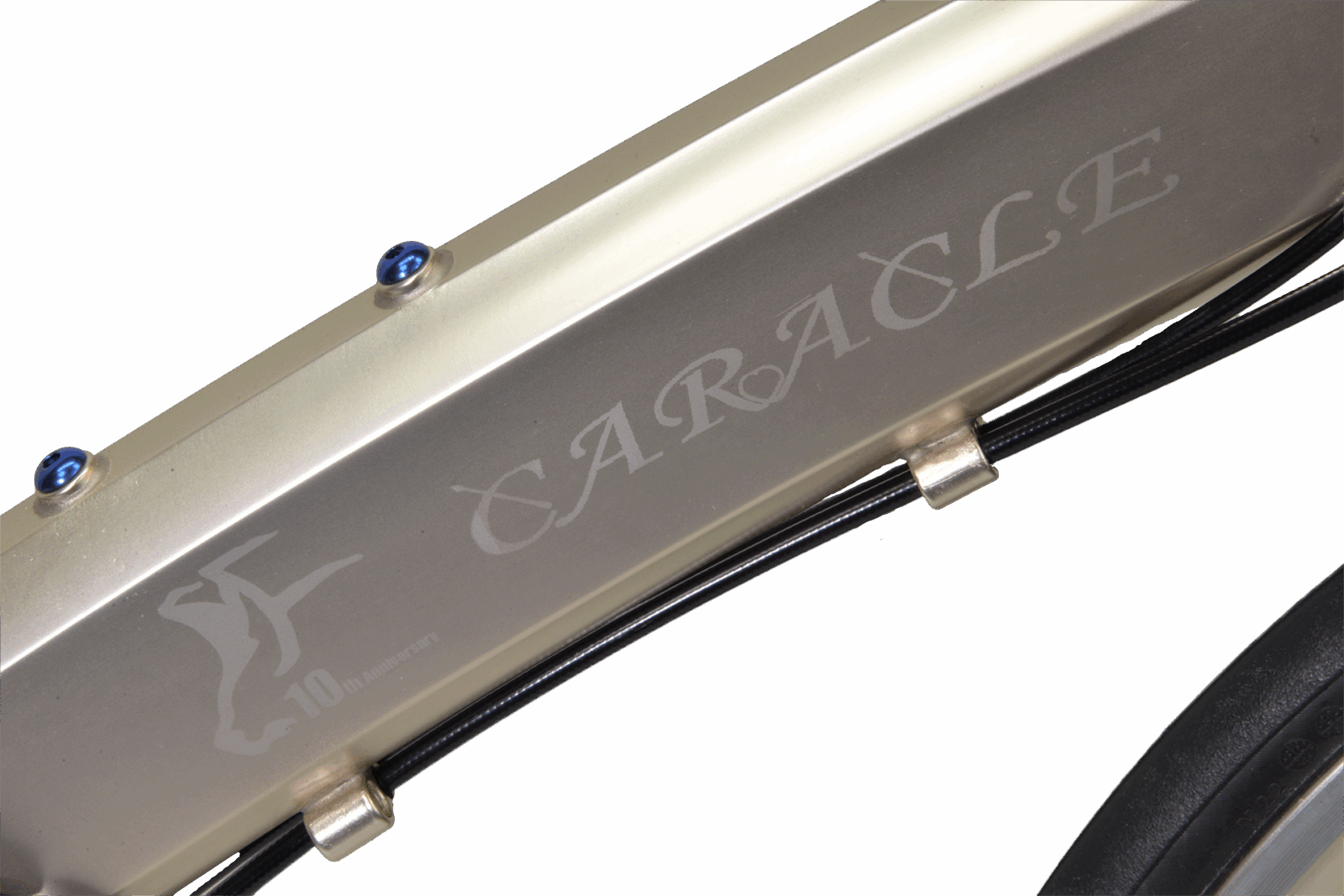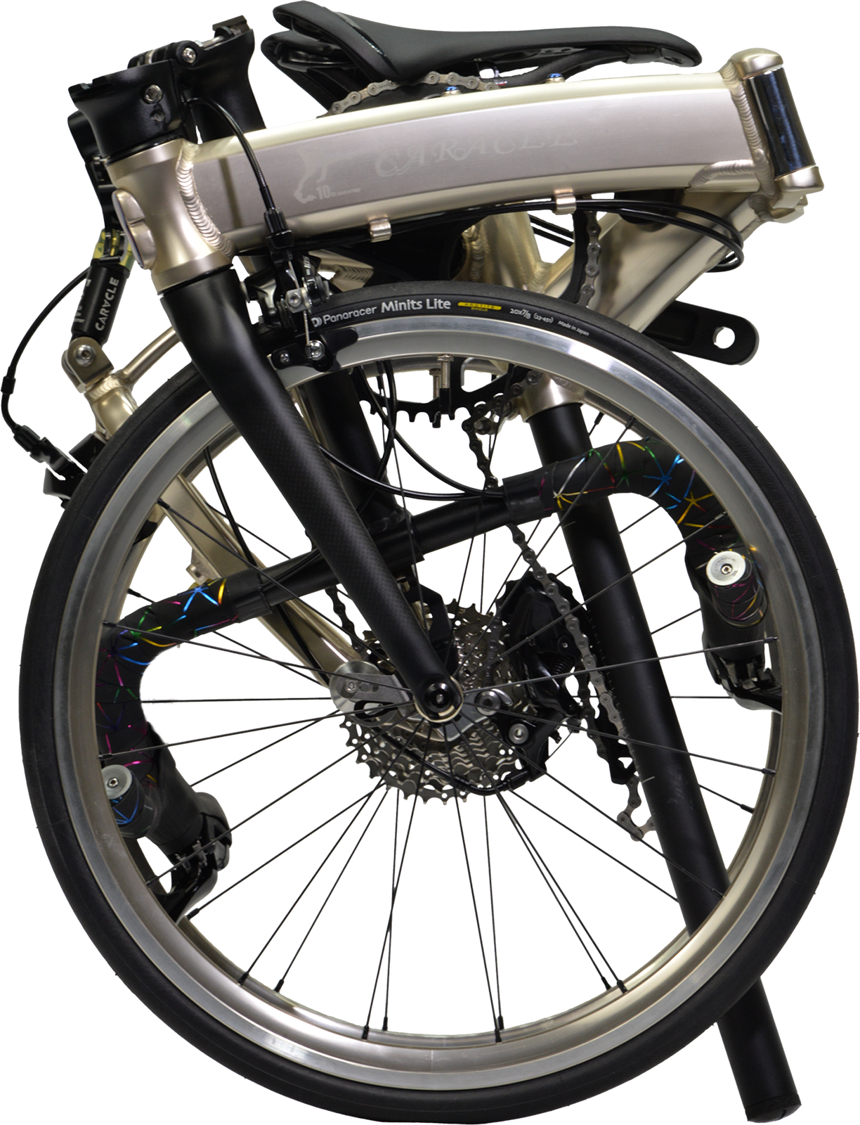 「世界最小」の折りたたみサイズと「ロードバイク並み」の走行性能を併せ持つ、折りたたみ自転車CARACLE-Sの10周年記念モデル第2弾。今度は20インチWO(ETRTO451)ホイールとカーボン製フロントフォークを採用した451RSをベースに、フレームをアルマイト着色してCARACLE-S初の限定カラー「シャンパンゴールド」と「ワインレッド」を、10周年を記念して合計10台ご用意しました(各カラー5台)。